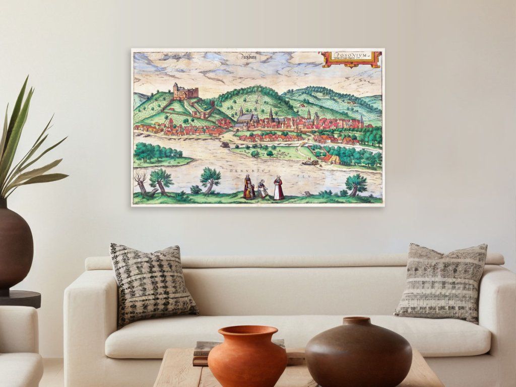 Veduta města Bratislava (tehdy označovaného jako Presburg či latinsky Posonium) pochází ze slavného atlasu Civitates orbis terrarum, který vytvořili Georg Braun a Frans Hogenberg na konci 16. století. Dílo patří mezi nejvýznamnější soubory městských vedut raného novověku a zachycuje Bratislavu v době, kdy byla důležitým politickým a správním centrem Uherského království. Město je zde zobrazeno z ptačí perspektivy, což umožňuje přehledně zachytit jeho hradby, uliční síť i dominanty, jako je hrad či hlavní kostely.