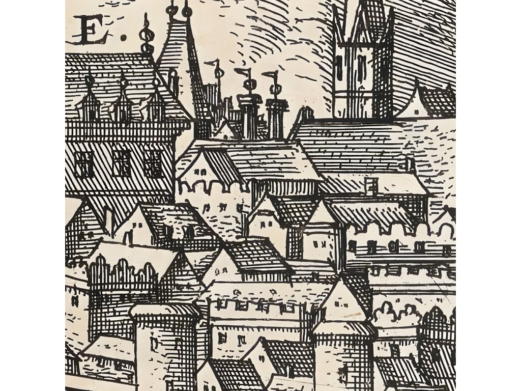 Veduta Brna z roku 1617, vytvořená na rytině Jorise Hoefnagela, představuje fascinující pohled na moravské město v období raného baroka. Joris Hoefnagel, známý vlámský umělec a kartograf, je proslulý svými detailními a precizními vedutami evropských měst. Rytina zachycuje Brno s výjimečnou přesností a pozorností k detailům, což poskytuje cenný historický a topografický záznam města v této éře. Pohled na město je z ptačí perspektivy, což umožňuje divákovi ocenit celkovou strukturu a rozložení městské zástavby, včetně klíčových staveb, opevnění a přírodních prvků okolní krajiny.