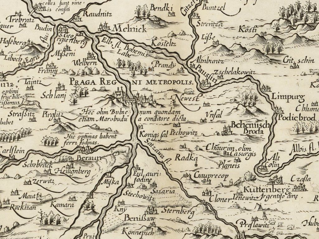 Reprodukce historické mapy Čech vytvořená Petrusem Kaeriem kolem roku 1618.